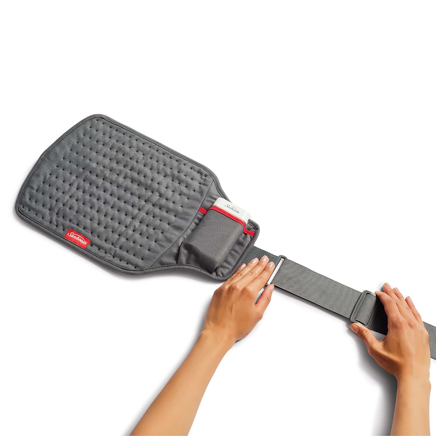 The Sunbeam® GoHeat™ Cordless Heating Pad delivers portable, soothing heat therapy for pain relief anywhere and anytime you need it. The 9.5 x 12-inch cordless heating pad provides targeted, high-level heat therapy to the back, arms, legs, and shoulders—whether you're at home or on the go. Just slip the battery unit/heating pad controller into the pad's side pocket, adjust the strap to fit, and enjoy hands-free pain relief. This portable heating pad uses a convenient, rechargeable lithium-ion battery that runs for up to 4 hours on a single charge on Low setting. The pad heats up fast so you can feel the heat in 30 seconds and offers 3 heat settings for customized treatment. The entire flexible, Micromink hot pad and adjustable strap are fully machine washable for easy care—just remove the battery.