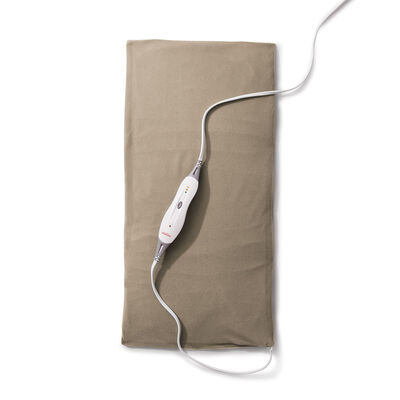 Sunbeam's King Size Heating Pad delivers soothing heat therapy for common muscle and joint pain. The 12in x 24in pad is extra long for more coverage on large muscle groups* to help accelerate tissue healing and relax sore muscles associated with muscle tension and stress. Customize treatment with 3 different heat settings and 2 hour auto-off. Enjoy convenient features such as an easy-to-use push button controller with LED heat setting lights for visibility in the dark, a long 9-foot cord for added convenience, and a moist heat sponge for optional deep, penetrating pain relief. The vinyl pad has a soft, machine-washable cover for easy care. *compared to Sunbeam Standard Size Heating Pads.